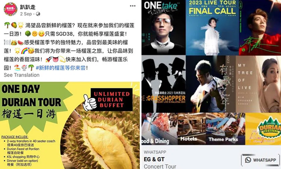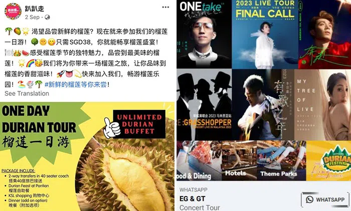 The police reported that the victims came across ads promoting cruises, tour packages, concert tours, and durian tours.