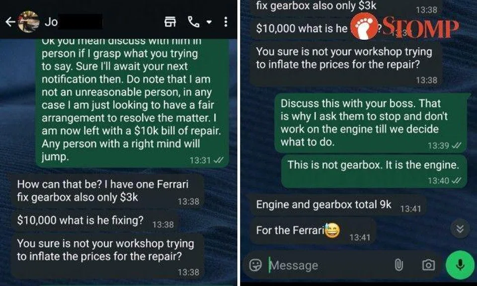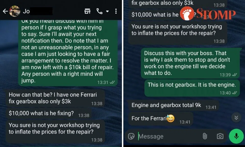 "I told him that the repair bill rests entirely on me. Then he mocked me by saying that a Ferrari repair would cost less and my trust in him completely eroded," said the Stomper, who shared a screenshot of the messages.