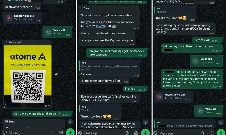 He told Stomp: "J texted me the estimated cost and offered installment plans via Atome. I clearly stated that she should wait for my payment the next morning before proceeding to order any parts as she had mentioned wanting to place the order immediately."