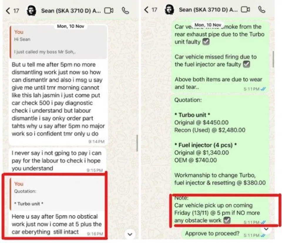 "At 5.11pm on Nov 10, our employee J provided Sean with pricing for the turbo and fuel injector, confirming a 5pm collection on Nov 13.