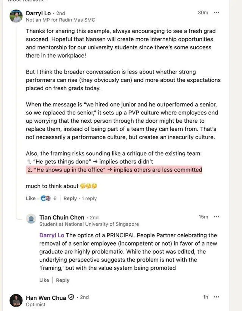 Independent General Election 2025 candidate Darryl Lo commented that while it was “encouraging to see a fresh grad succeed”, the broader issue was how the post appeared to set up an insecurity-driven culture.