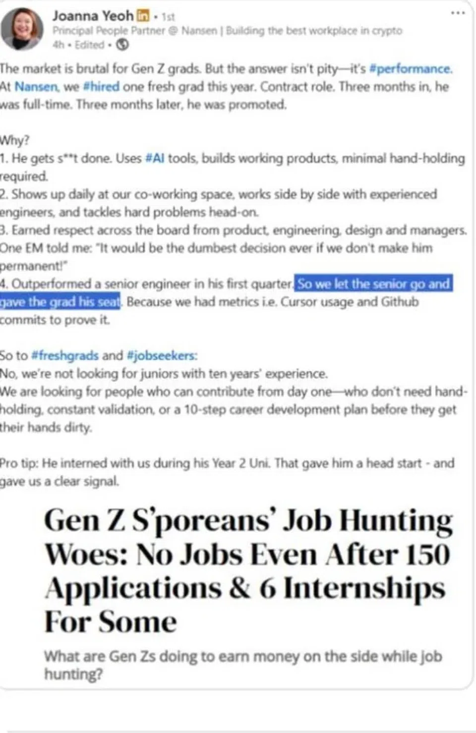 According to screenshots shared by the Stomper, which were also circulated on subreddit r/singaporejobs, Yeoh's post described how a fresh graduate "outperformed a senior engineer" within three months, after which the senior was let go and "the grad (was) given his seat".