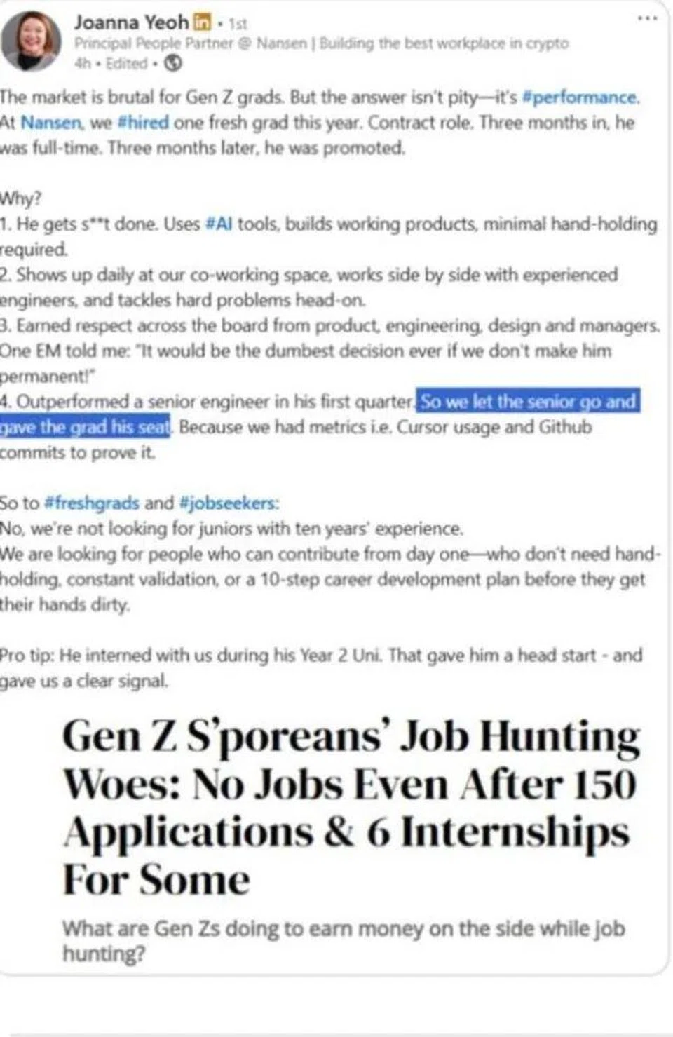 According to screenshots shared by the Stomper, which were also circulated on subreddit r/singaporejobs, Yeoh’s post described how a fresh graduate “outperformed a senior engineer” within three months, after which the senior was let go and “the grad (was) given his seat”.