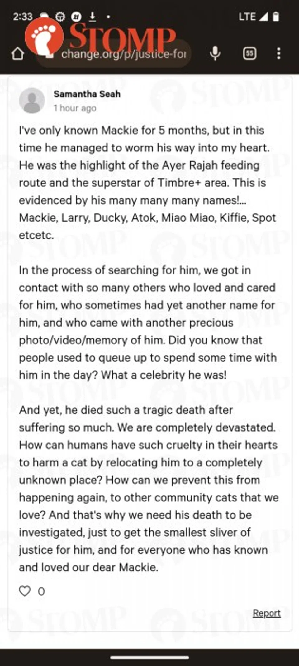 On top of that, a member of a cat interest group has set up a petition to appeal for information and to get justice for McKiffie Laduck's death.