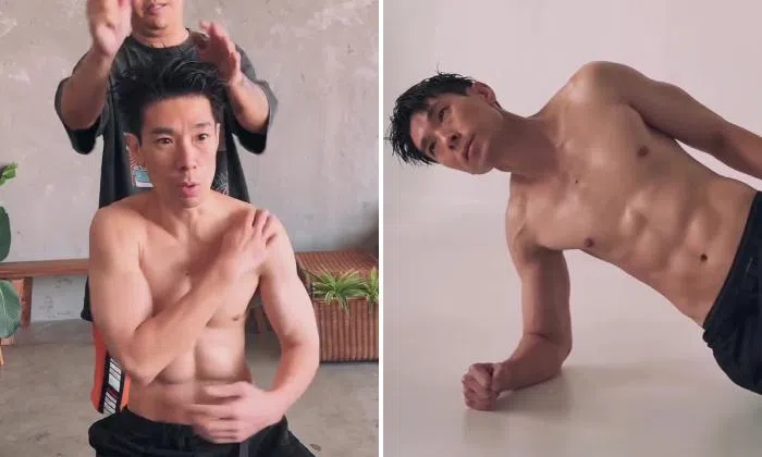 The Mediacorp artiste, who is married with two sons aged 16 and 13, was seen in the photos either topless or wearing a shirt exposing his abs.