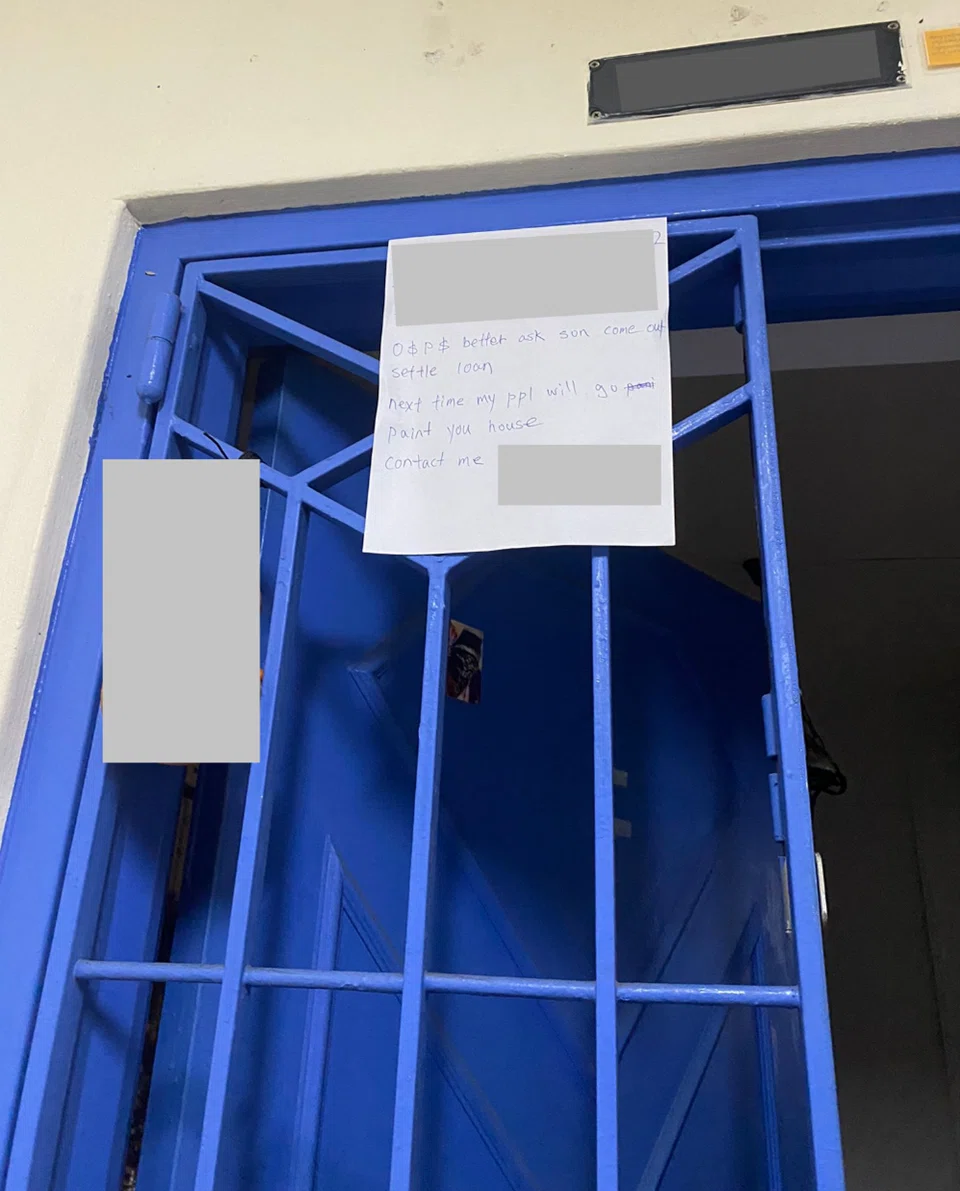 One of the two allegedly pasted a debtor's note on the gate of a flat that said: "O$P$ better ask son come out settle loan. Next time my ppl will go paint you house (sic)."
