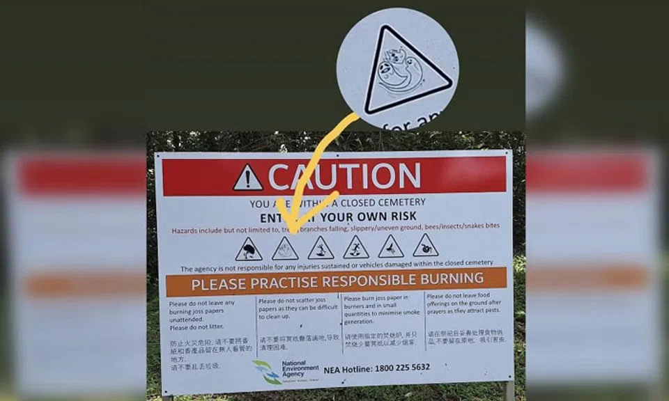 NEA said that after it was alerted to the Facebook post, it conducted inspections at a closed cemetery on Feb 19 and found that several of its other warning signs also had the same sticker pasted on them. It did not confirm if the signs were located at Bukit Brown Cemetery.