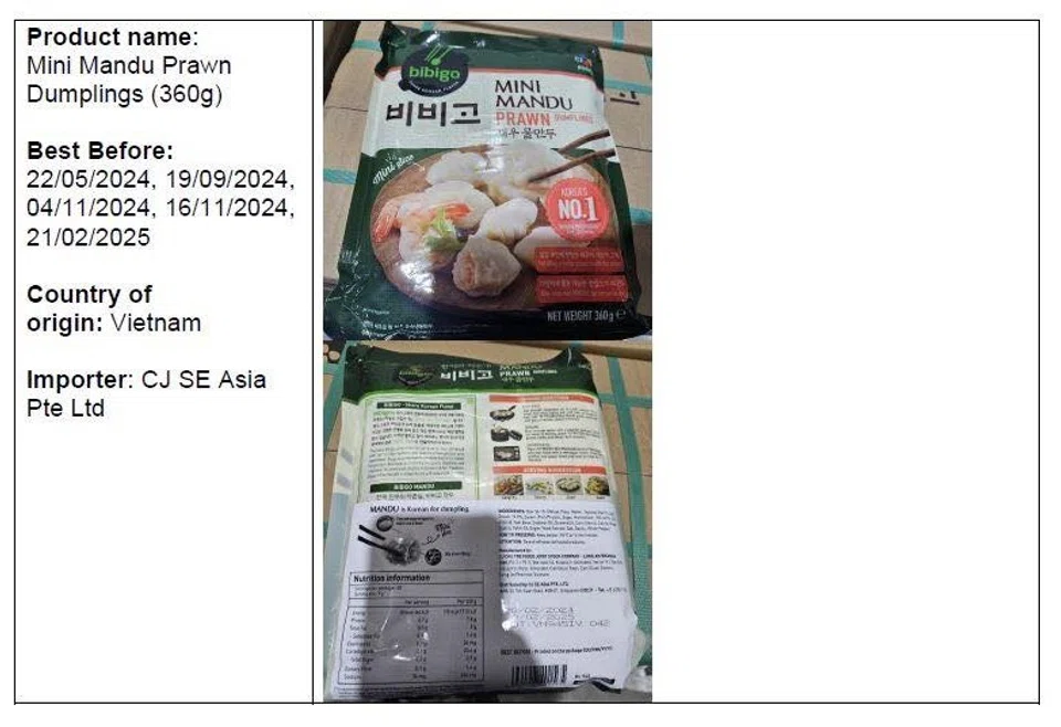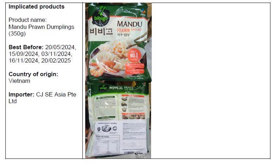 Bibigo's Mandu Prawn Dumplings (350g) and Mini Mandu Prawn Dumplings (360g) from Vietnam were voluntarily recalled by the manufacturer, CJ Cau Tre, due to undeclared egg allergen.
