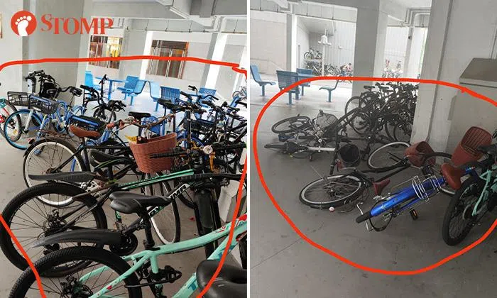 Photos shared by Wee show bicycles parked around void decks, with some toppled over.