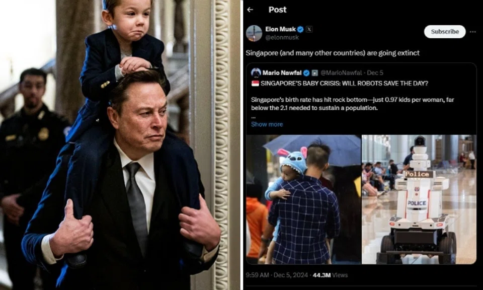 In a recent tweet on X, billionaire Elon Musk declared that Singapore, along with other countries, is "going extinct" because of its low birth rate.