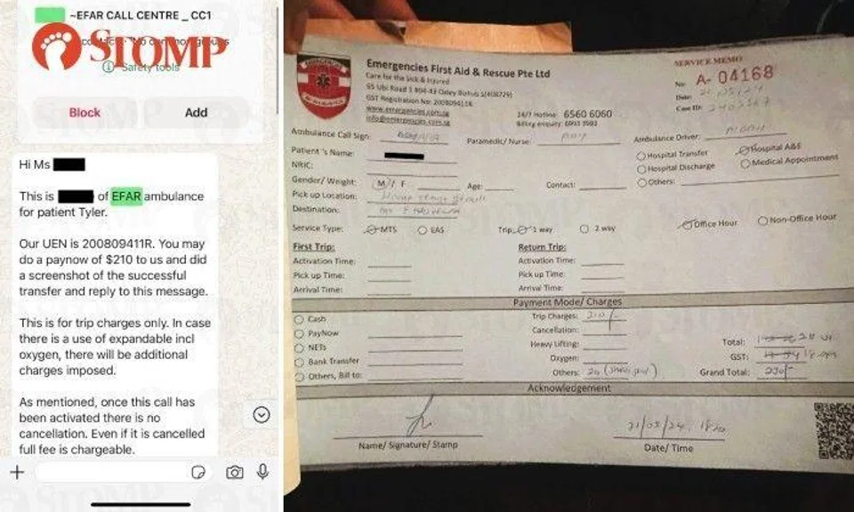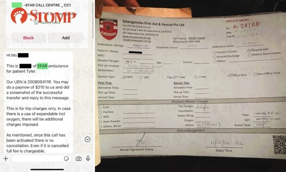 The Stomper said: "We asked them to call the ambulance and quickly took turns to change to dry clothes while tending to our son. After we were changed, the private ambulance company called me to inform me that I needed to make payment of $210 first before the ambulance can come.