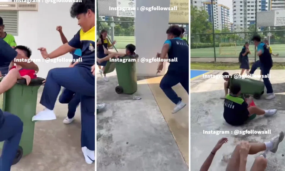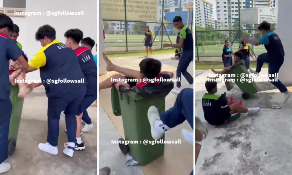 In a video circulating online, a boy in Sembawang Secondary School PE T-shirt can be seen sitting in a green trash bin as his schoolmates surround him.