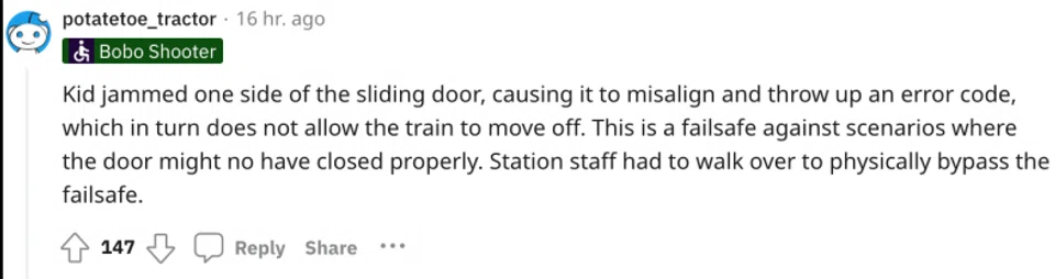 As a prank, a boy filmed an MRT train that could not move because the platform screen doors (PSDs) were obstructed.