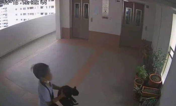 It showed a black cat exiting a lift, followed by the young boy. Seconds later, he picked up the cat and looked around before throwing it over the railing. Its mangled carcass was later found at the void deck by its feeder, Ms Umi Solikati.