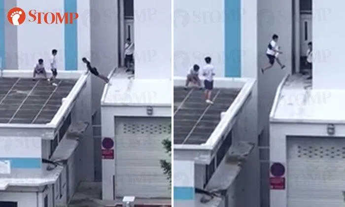 In a video she shared with Stomp, the boys can be seen leaping from a ledge on the second-storey of the HDB block to the roof of a small building next to it.