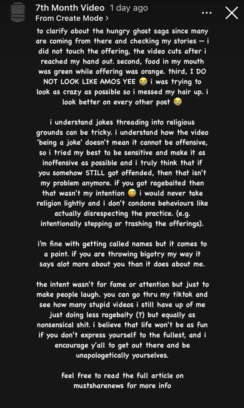 In an Instagram story posted on Sept 3, he explained: "I understand how the video 'being a joke' doesn't mean it cannot be offensive, so I tried my best to be sensitive and make it as inoffensive as possible."