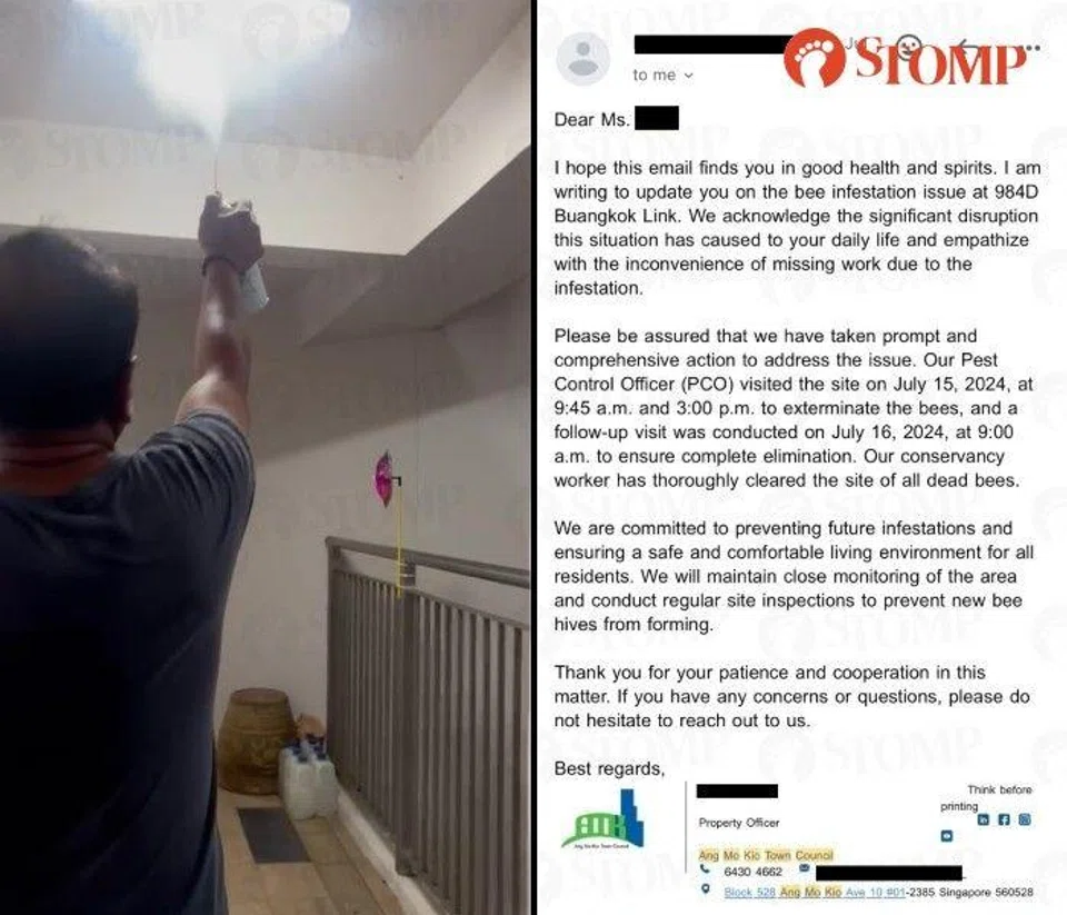 In response to a Stomp query, a spokesperson for Ang Mo Kio Town Council said it received feedback about the bees on the night of July 14.