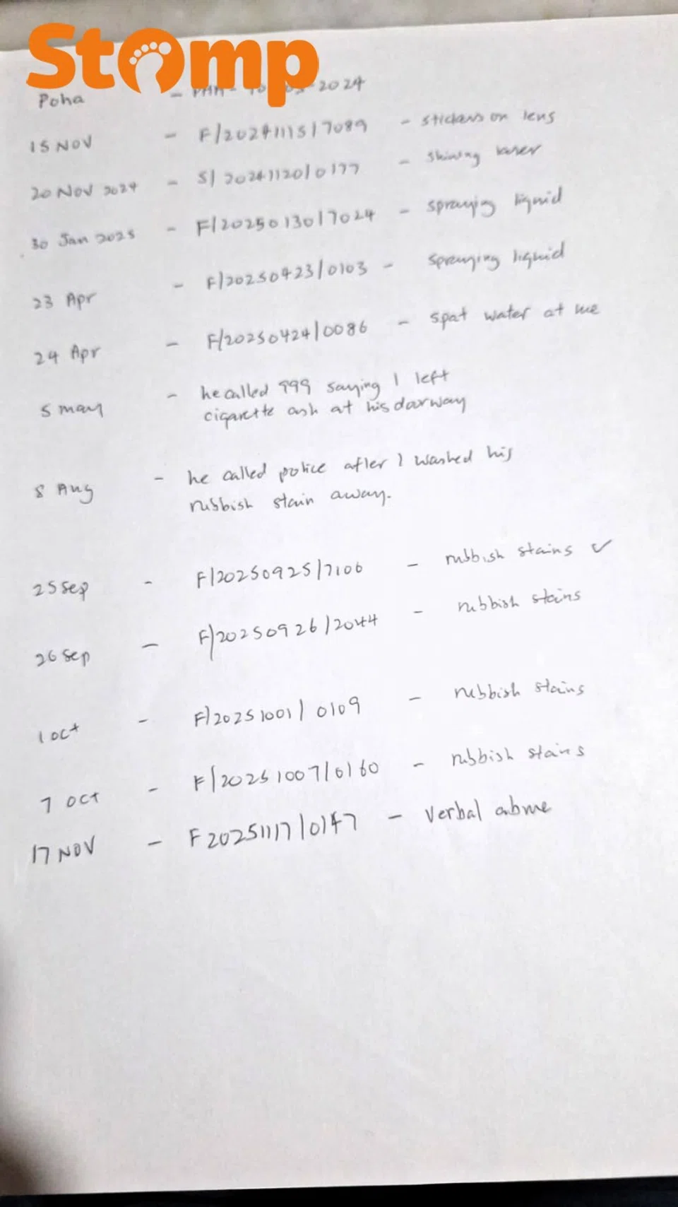 "I have a magistrate's complaint, a POHA (Protection from Harassment Act), at least 10 police reports, complaints to the town council, HDB and MP. They just pushed it to someone else.