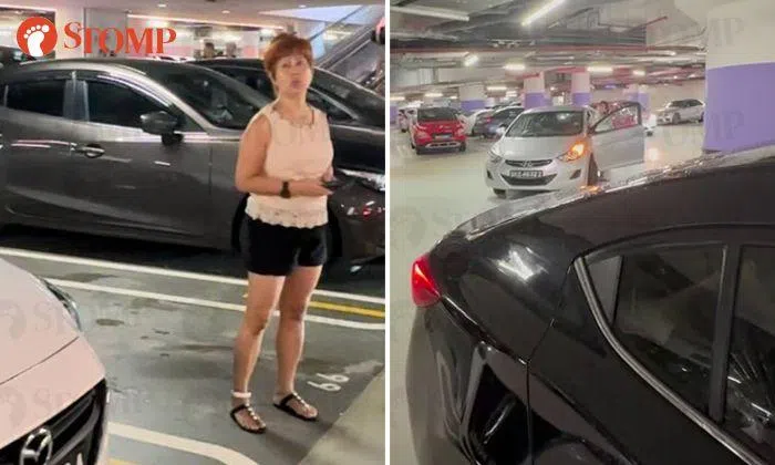 In the video, the woman is seen standing in the parking lot despite being reprimanded by another driver, who can be heard saying, "Auntie, auntie. One two three fours cars. Waiting for you, standing there. You buay paiseh ah?"