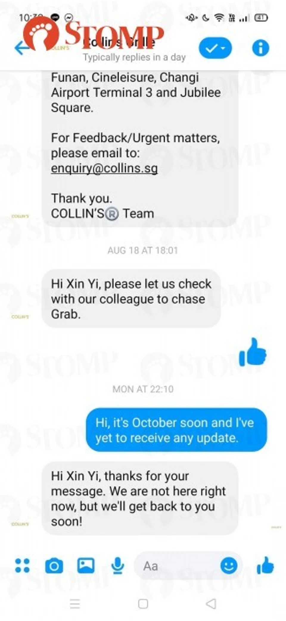 Stomper Xin Yi ordered two set meals from Collin's Westgate outlet via GrabFood on July 31 at 5.14pm.