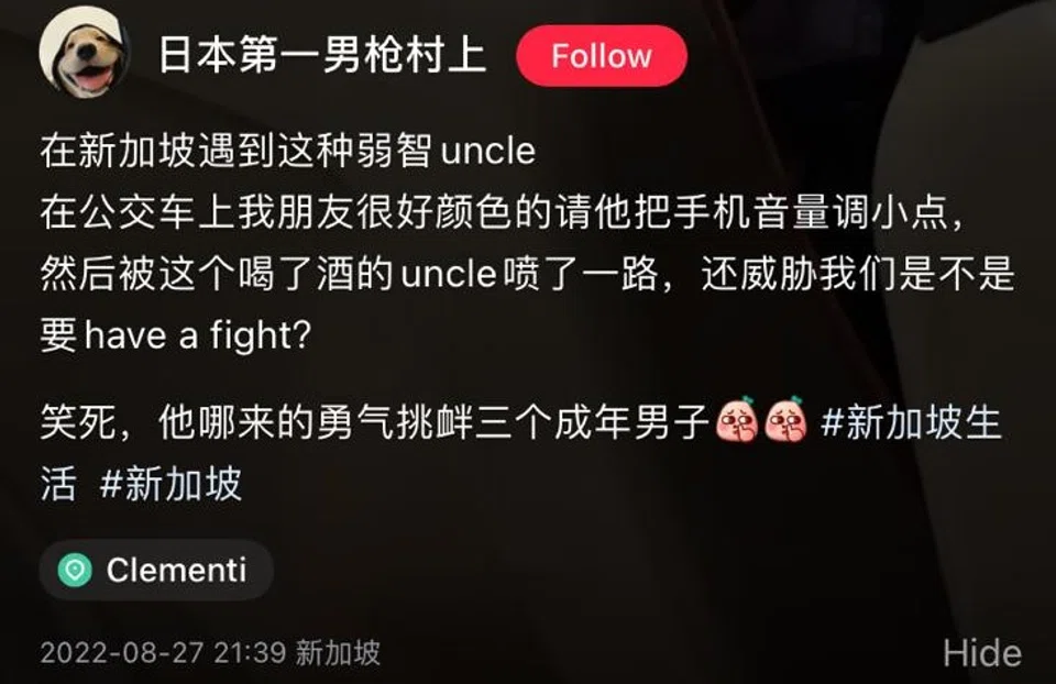 The description said: "On the bus, my friend nicely asked him to turn down the volume on his phone. After that, this drunk uncle ranted at my friend all the way. He even threatened, do we want to have a fight? Hilarious. Where did he get the courage to challenge three grown men?"