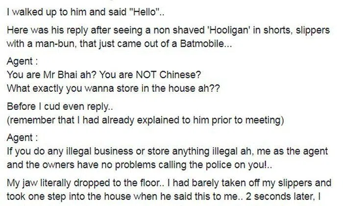"Agent: 'You are Mr Bhai ah? You are not Chinese? What exactly you wanna store in the house ah? If you do any illegal business or store anything illegal ah, me as the agent and the owners have no problems calling the Police on you!'