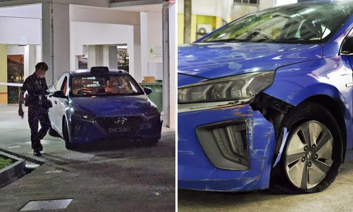 Photos published by Shin Min Daily News show a ComfortDelGro taxi on a walkway below the HDB block.