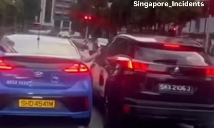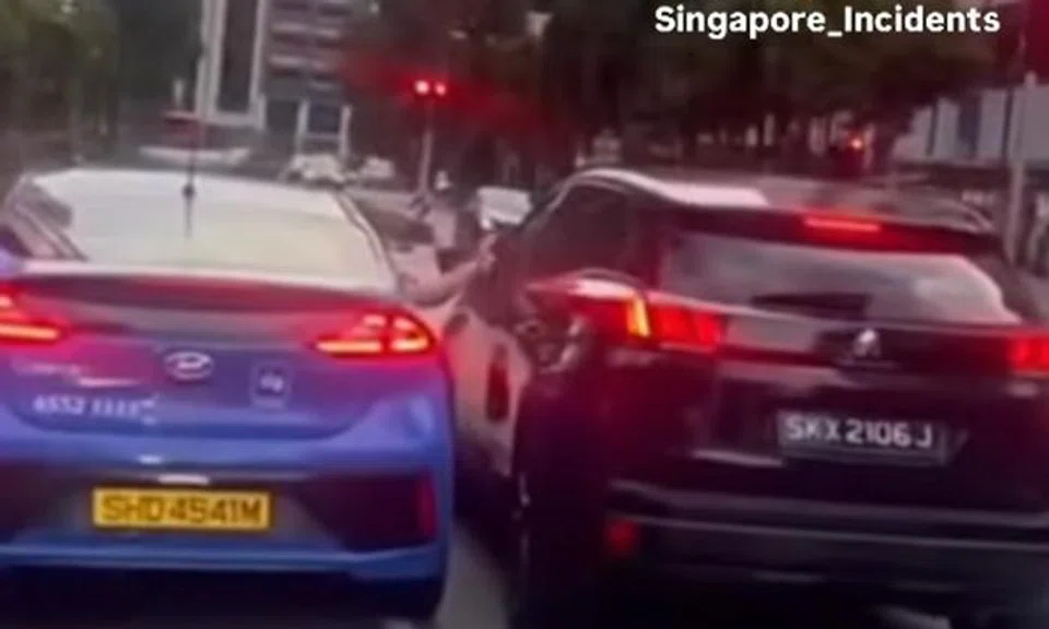 Cabby stops taxi next to car at Tanjong Pagar junction, reaches out to knock on window and scolds driver