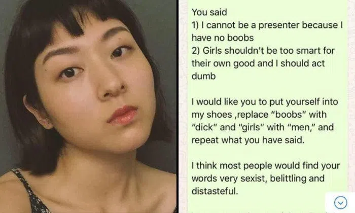 In a Facebook post last week, Miss Park shared screenshots of a WhatsApp conversation she had with the colleague, where she confronted him for making sexist remarks about her.