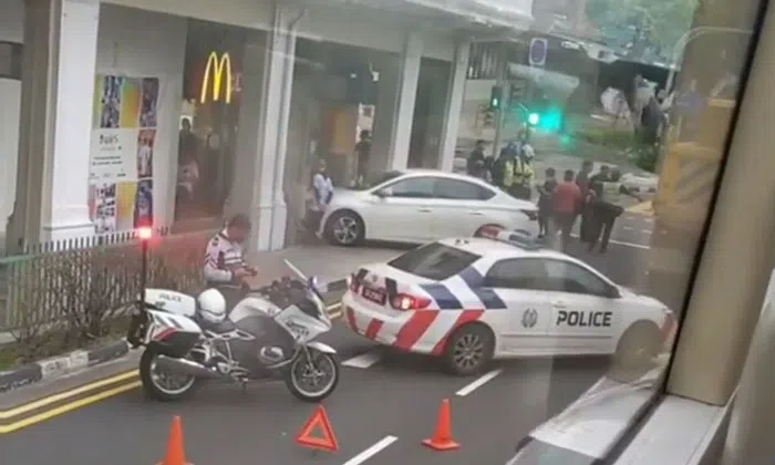 A white Nissan car mounted a kerb and almost ended up inside a McDonald's restaurant at Bugis Village.