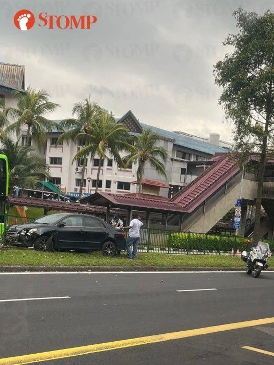 Stomper Wilson shared a photo of a damaged black Toyota Vios, which had stopped next to the railing on the grass verge of the centre road median with a Traffic Police motorcycle nearby.