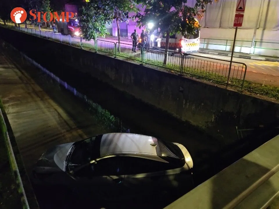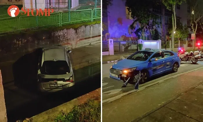 A car ended up in a drain after an accident with a taxi at the junction of Queen's Road and Lutheran Road in Bukit Timah late Tuesday night (April 25).