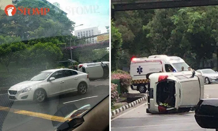 A white car flipped onto its side after an accident at Havelock Road on Friday afternoon (June 15).