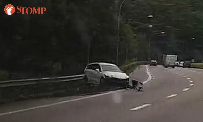 Car sent spinning after skidding and crashing into road barrier on PIE slip road