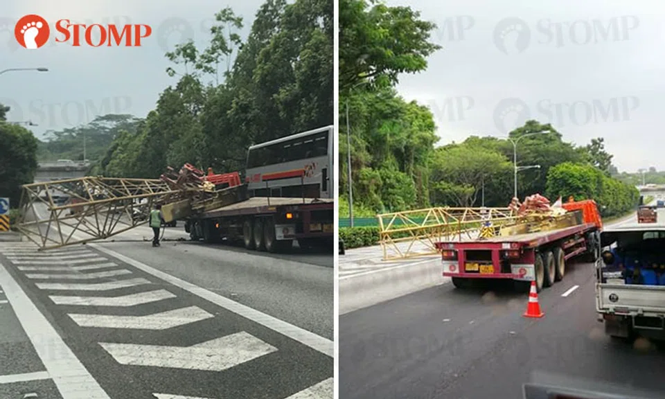 Cargo, including a two-tonne crane boom, toppled and fell off the back of a trailer on the Pan-Island Expressway, just before the Adam Road Exit on late Monday afternoon (April 2).