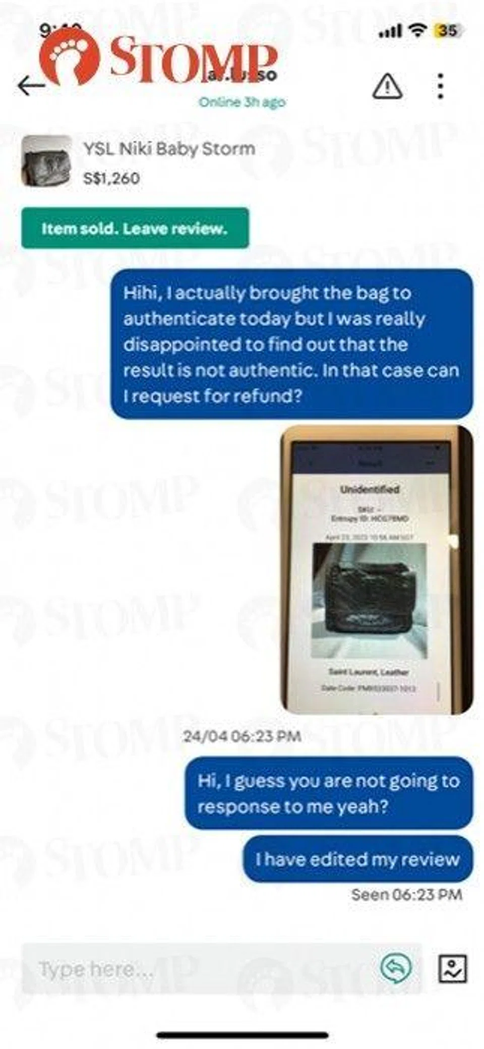 "So, after I got the result of authentication, the seller did not respond to my messages on Carousell anymore.