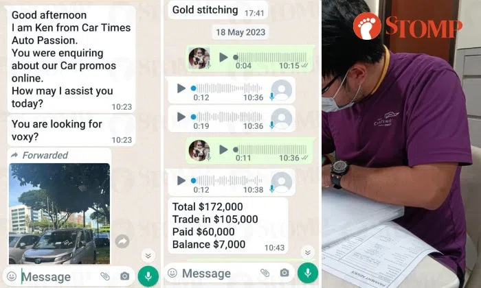 "He pointed to the clause stated on sales agreement indicating that 'All payment above $3,000 must be in cheque/CO made payable to CarTimes Automobile Pte Ltd' as if the instructions given to me were not given by their own salesman.