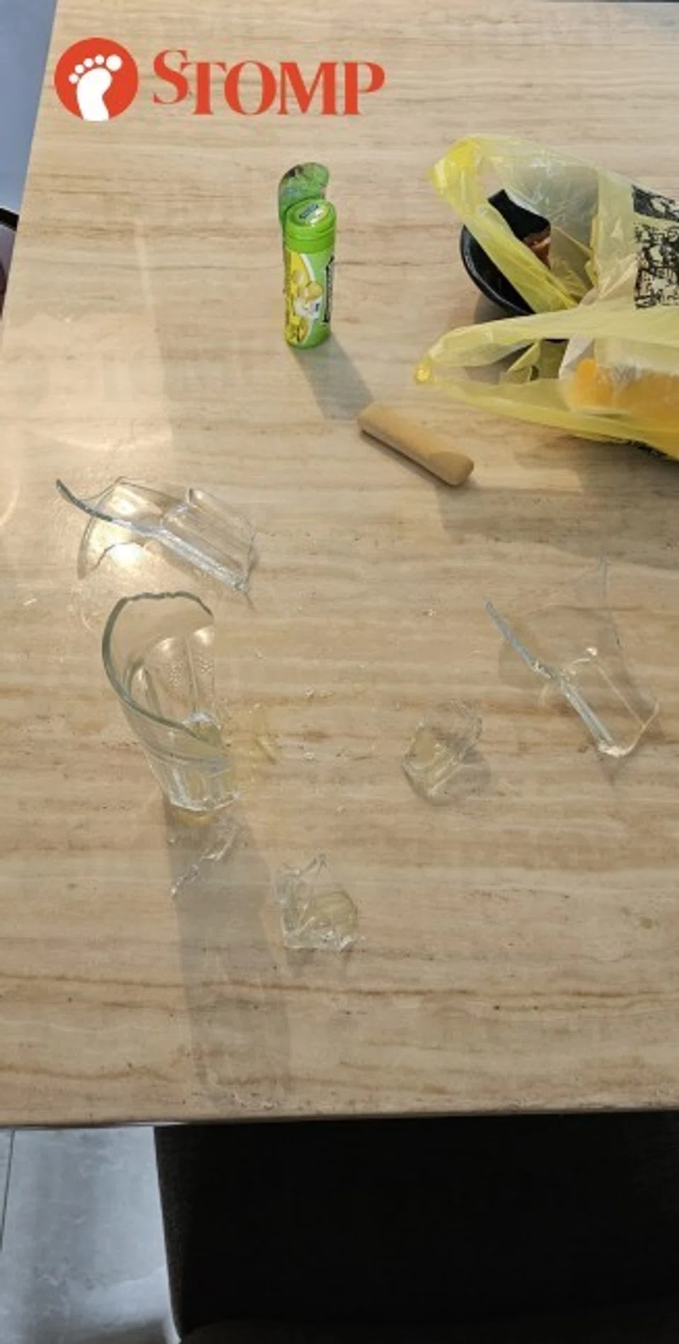 "Pieces of shattered glass were on the baby seat and floor. At first, I thought a glass fell on the ground in the kitchen. Then I came to realise that the broken glass was on the table.
