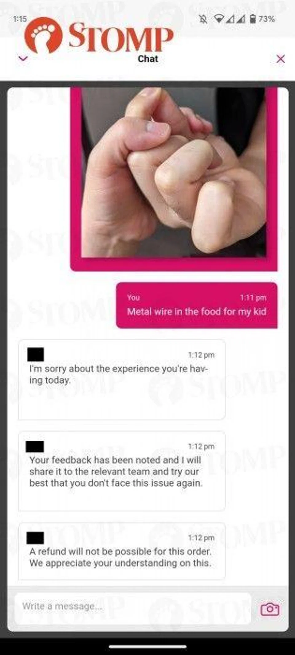 In screenshots shared by the Stomper, the customer service agent apologised and said they would share her feedback with the 'relevant team' but said 'a refund will not be possible for this order'.