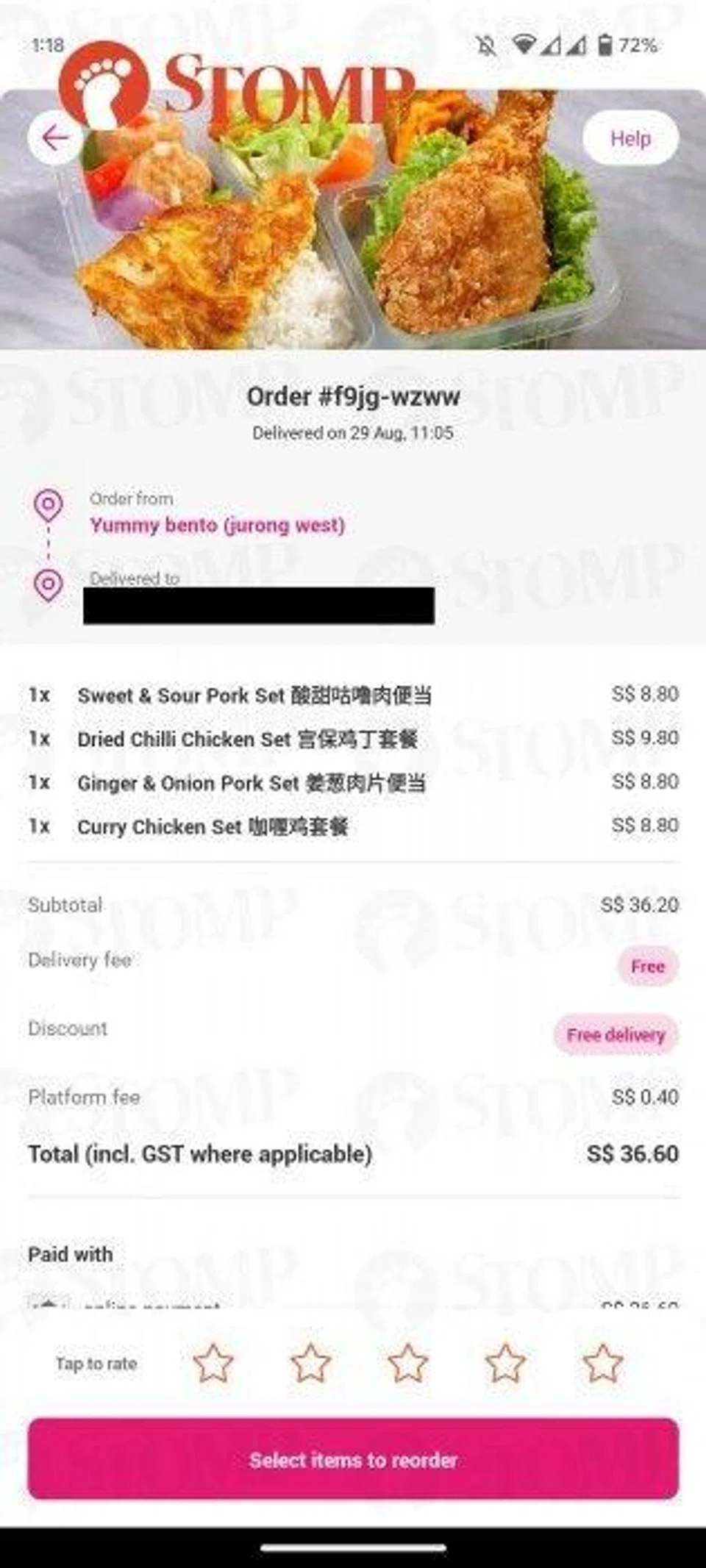 Stomper A told Stomp that she had ordered food from Yummy Bento at Jurong West via Foodpanda on Aug 29.