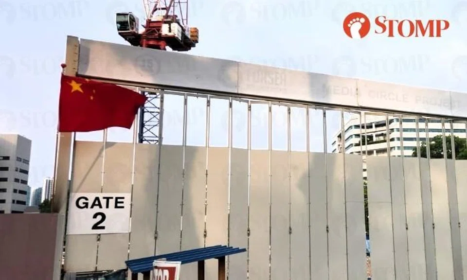 Stomper ZR shared photos of the red flag on a pole stuck on Gate 2 of the Bloomsbury Residences worksite at Media Circle. A Singapore flag was displayed at the other end of the gate.