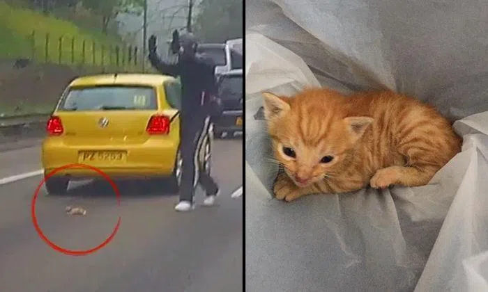 In the dashcam footage uploaded onto Facebook last week (Apr 27), the off-duty firefighter can be seen stopping rush-hour traffic and picking up a tiny kitten on the road before running back to his motorcycle parked by the roadside.