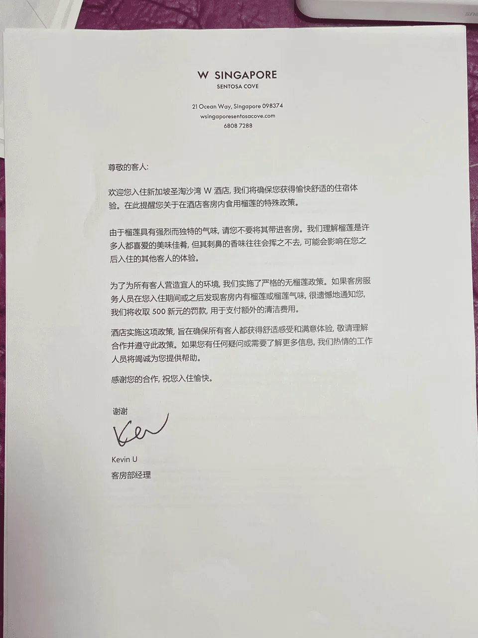 "Due to the pungent and unique smell of the durian, please do not bring it into the hotel room,” read the letter.