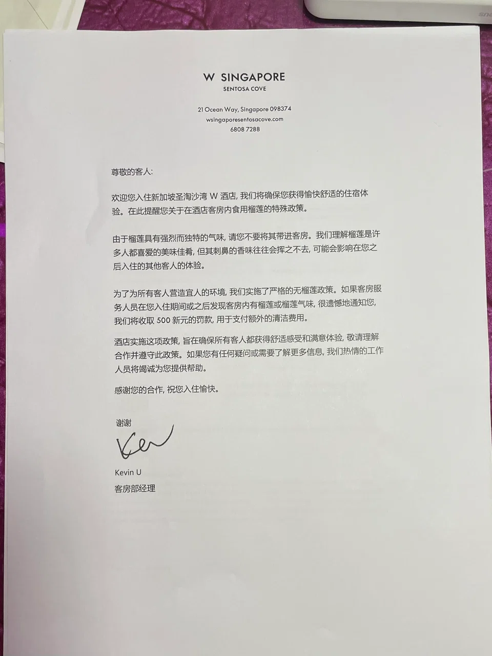 Guests will receive a $500 fine if hotel staff detect the smell of durians in the room, the letter added.