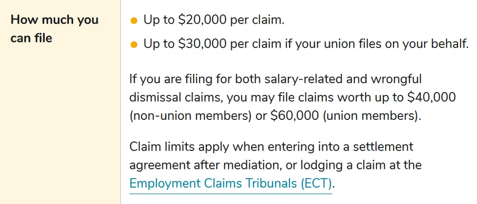 While he can file a claim with the Employment Claims Tribunals (ECT), the cap is $20,000 - meaning he would have to forgo the remaining $44,000.