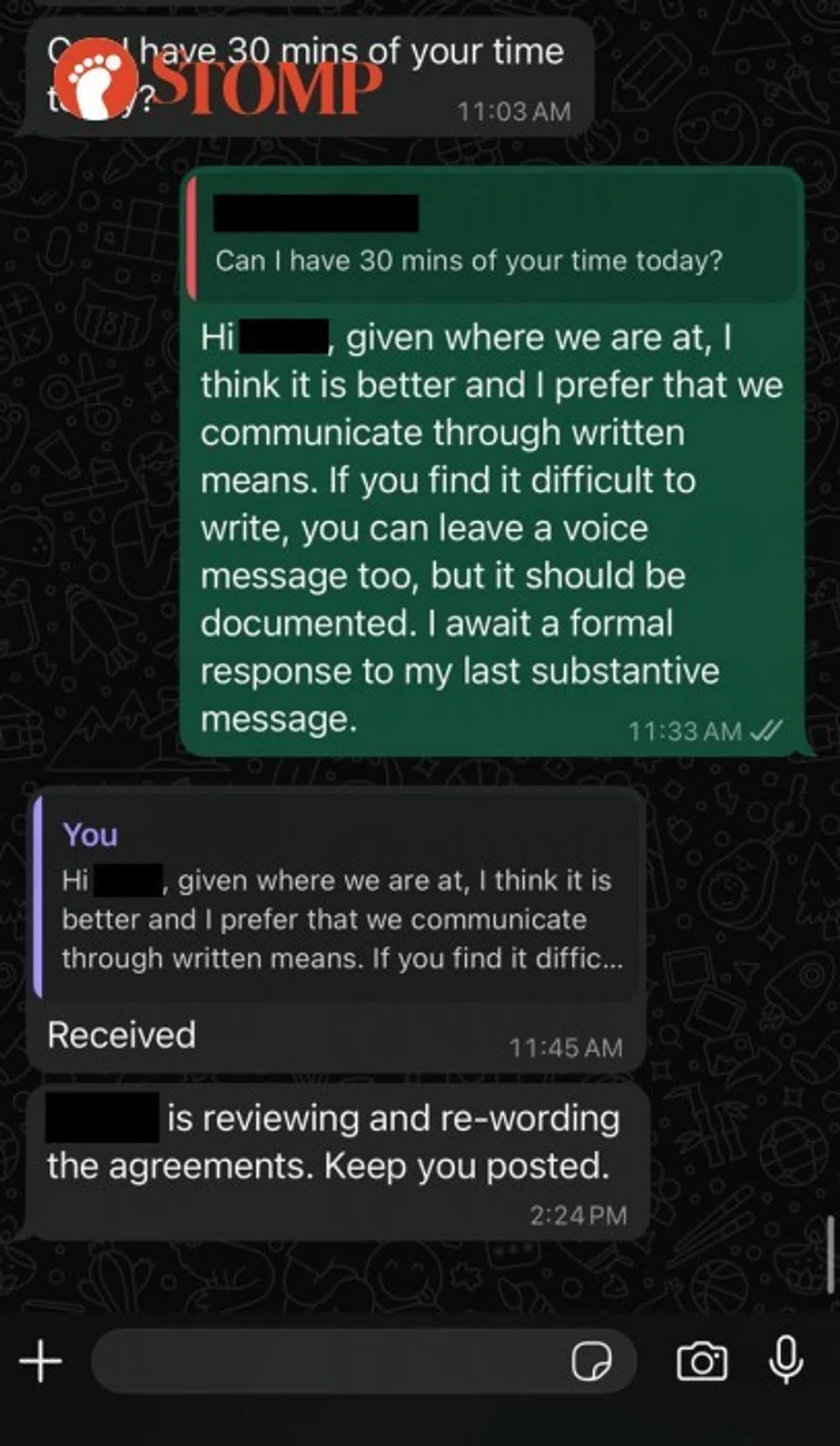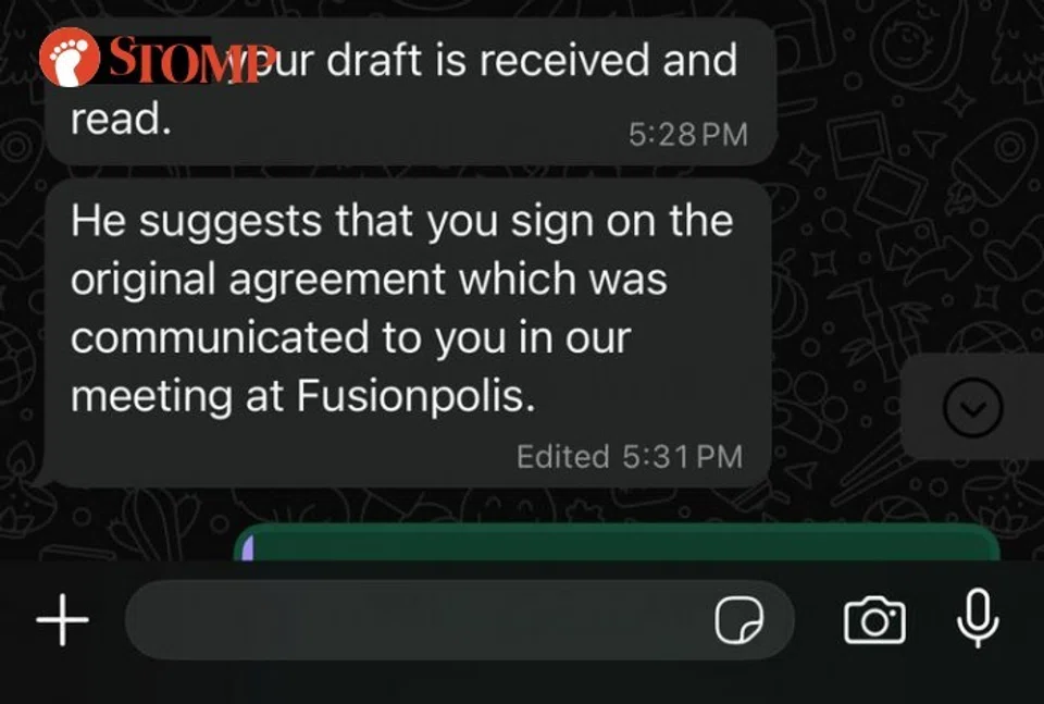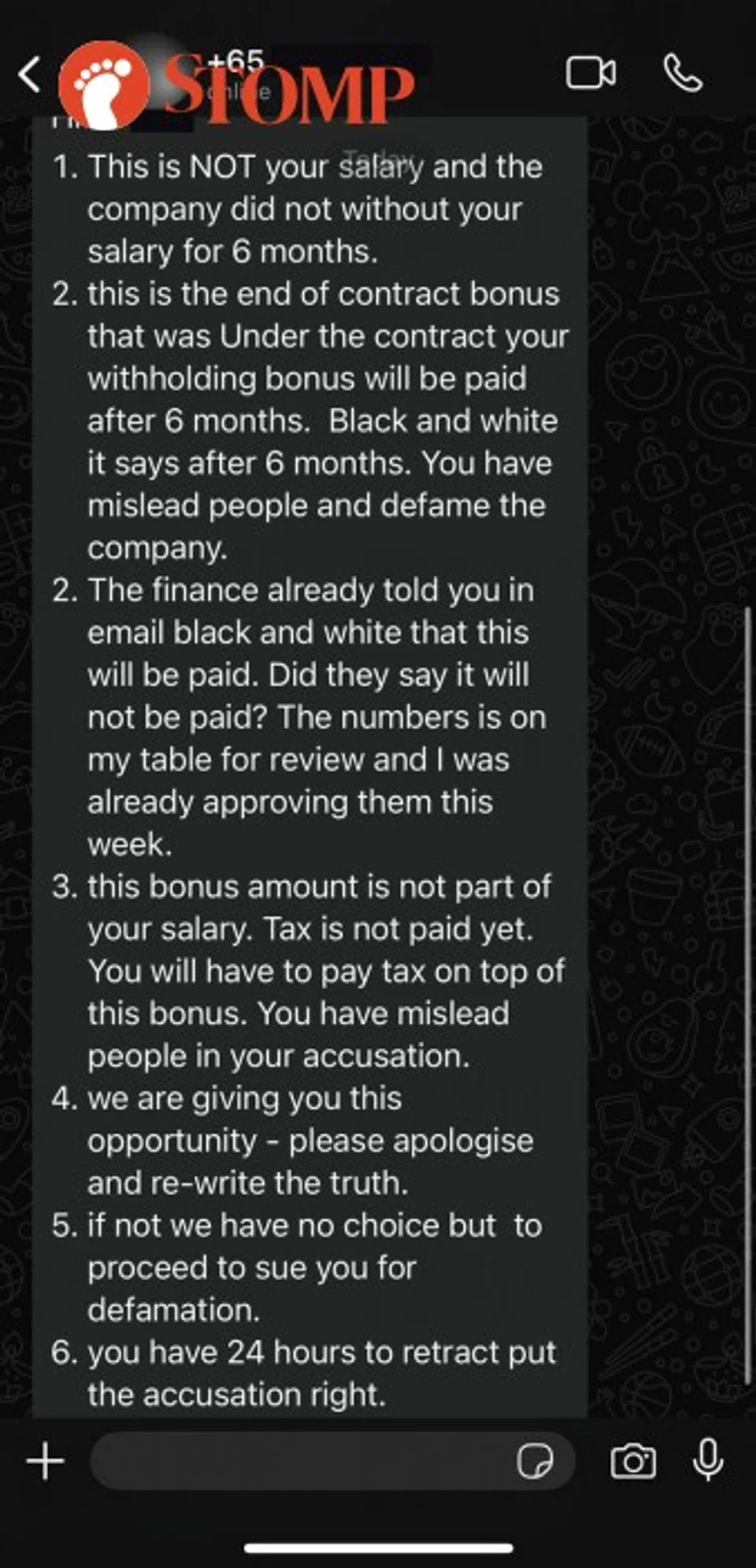 In the message seen by Stomp, the company denied withholding his salary and acknowledged that the amount in question was his EOB, which they said would be paid six months after his contract ended.