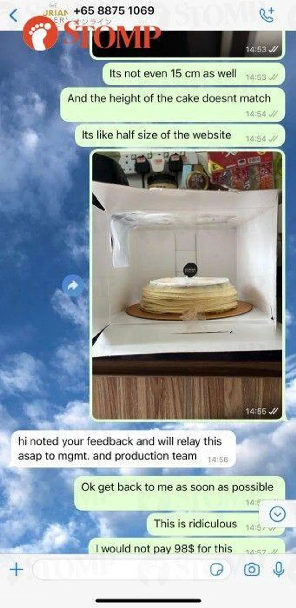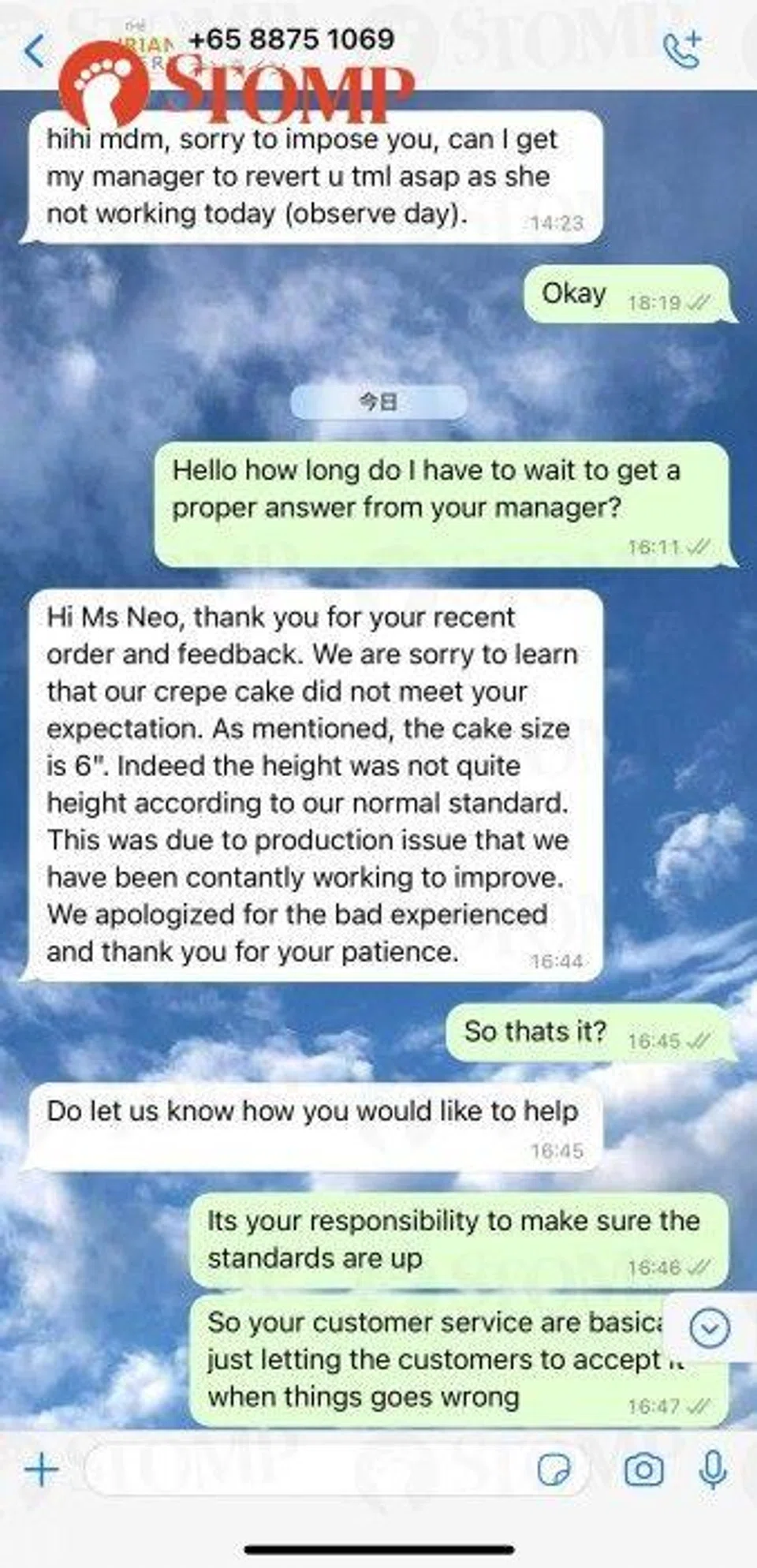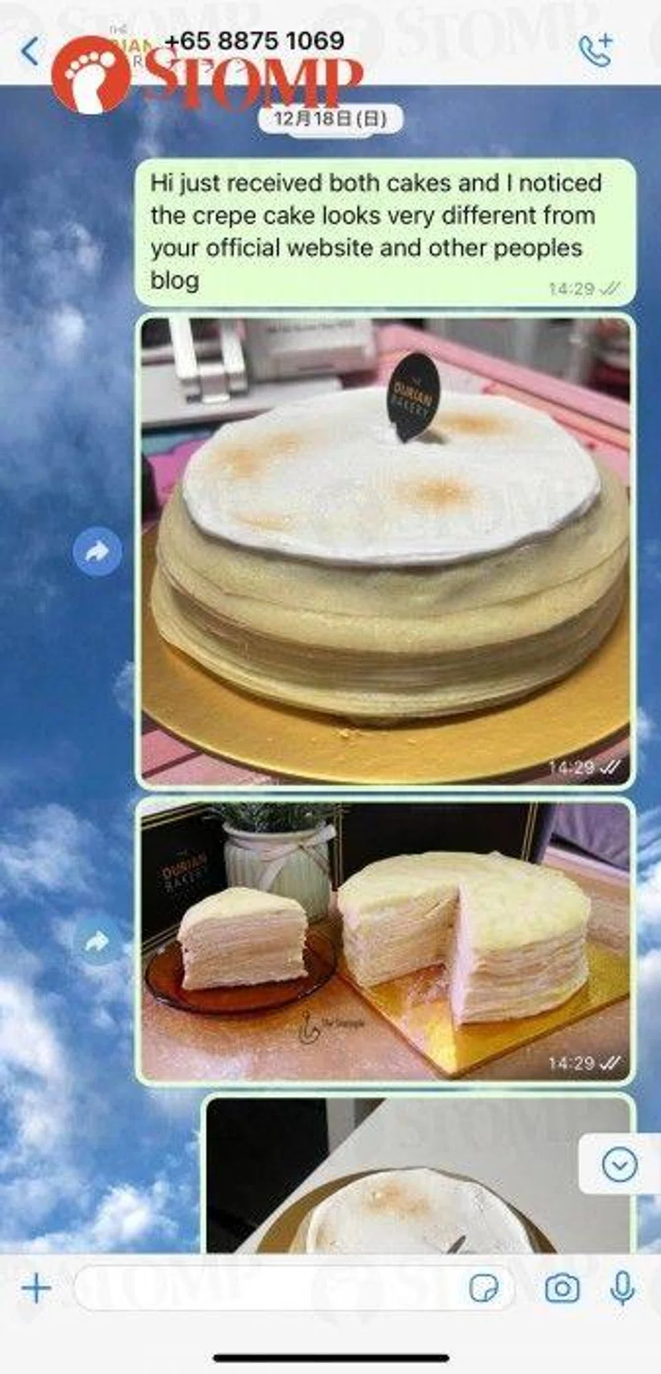 In one screenshot, the bakery is seen saying, "We are sorry to learn that our crepe cake did not meet your expectation."