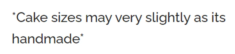 A disclaimer on the product page states that sizes of the cake may vary due to it being handmade.