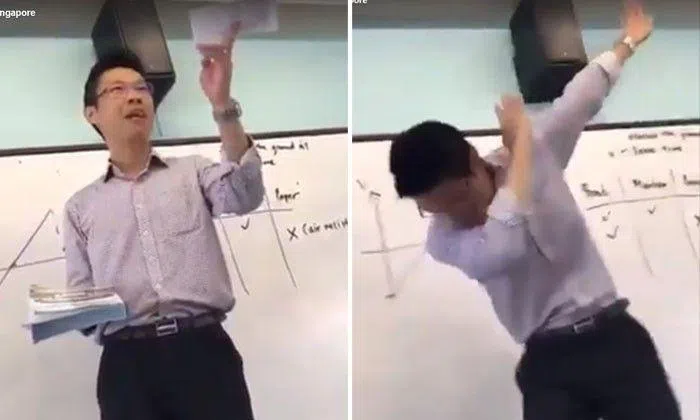 Mediacock Singapore has posted a video showing a teacher capturing the attention of his class in a rather unusual but effective way.