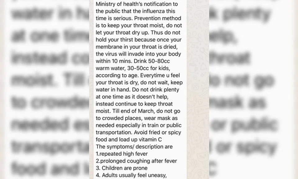 Ciculated message about 'MOH advice' on how not to catch influenza is a hoax